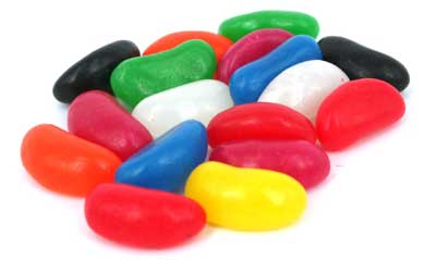 Jelly beans are small bean-shaped sugar candies with soft candy shells and thick gel interiors. The confection comes in a wide variety of colors and flavors, and is primarily made of sugar.