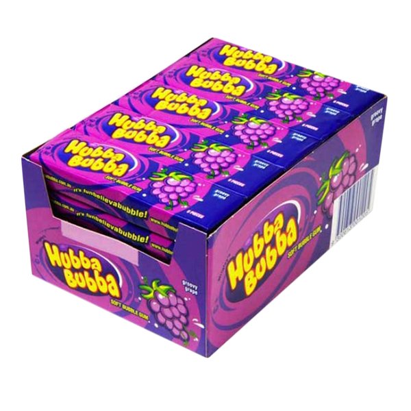 The famous Hubba Bubba Soft Bubble Gum - Grape flavour. (20 packs of 5 pieces in each display unit)