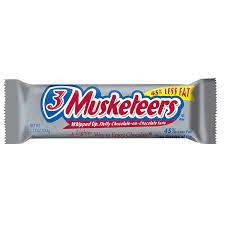 A three musketeer's bar is a candy bar consisting of chocolate-covered, fluffy, whipped nougat.